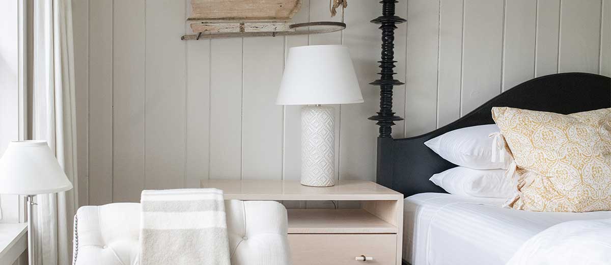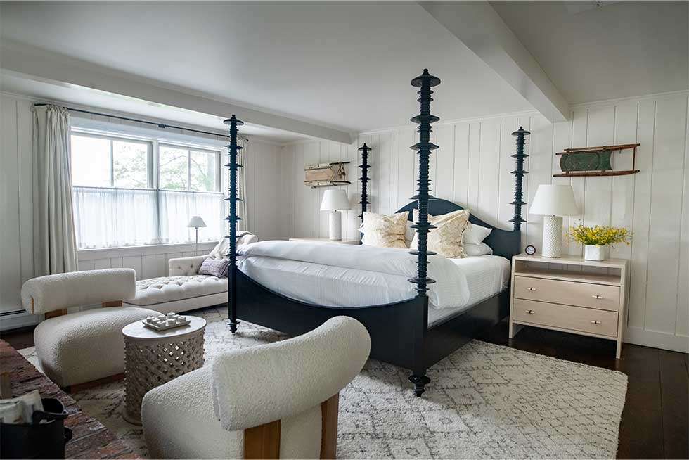 “So It Goes” – One of three guest rooms that are located in the separate Hemlock House, this spacious room is worthy of the word luxurious. Featuring a king-sized spindle bed and vintage wooden sleds hanging on the walls, this room is a guest favorite. A wood-burning fireplace is ready for you to choose whether to relax on the chaise lounge next to the fire, or enjoy the serene landscape from the large windows.